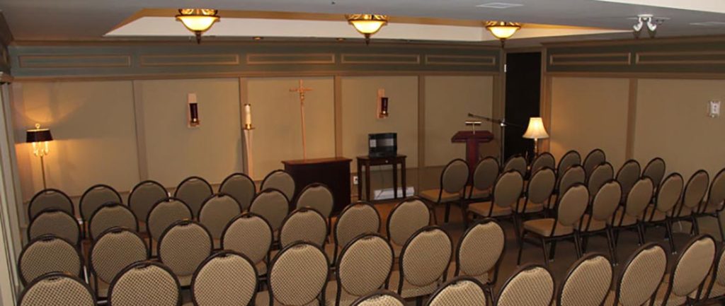 Au second plancher en sortant de l’ascenseur, vous retrouverez à votre gauche deux autres salles d’exposition, et à votre droite une chapelle multiconfessionnelle. Les familles peuvent y faire venir leur propre célébrant, ou nous pouvons leur en trouver un.